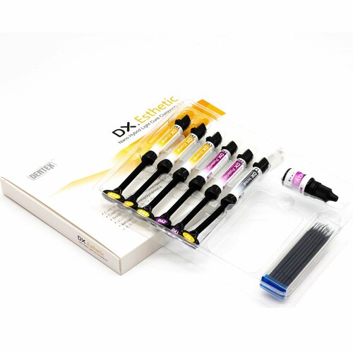 DX. Esthetic Composite Kit – включает в себя набор композитов для эстетической реставрации зубов. Данный комплект можно использовать для реставрации переднего и заднего дентина и эмали, восстановление виниров. Содержание неорганического наполнителя составляет от 75% до 82% по массе, размер частиц варьируется от 0,03 до 5 мкм. Внешний вид пастообразный продукт с высокой вязкостью, обладает рентгеноконтрастным качеством.