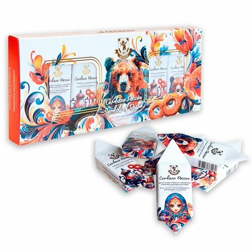 Конфеты упакованы в красивую сувенирную коробку с русскими узорами.