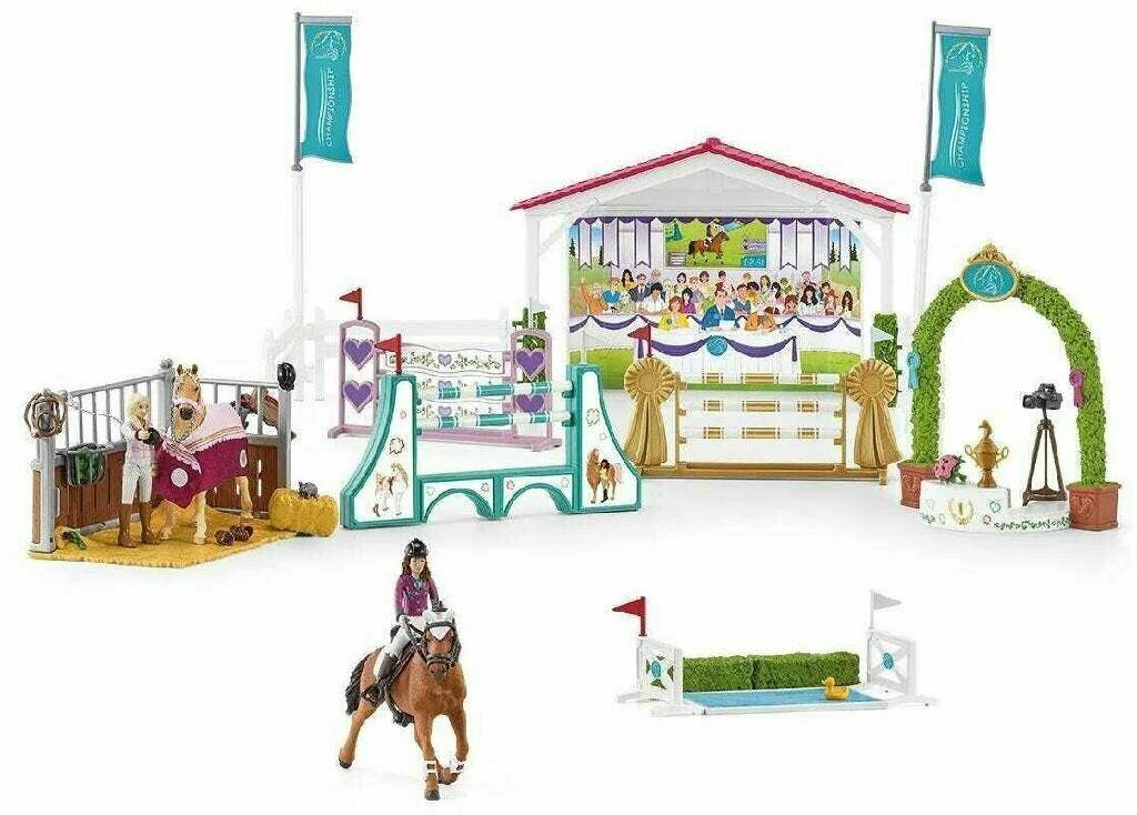 Schleich Набор Конный дружеский турнир В товарищеском турнире Schleich Horse Club София скачет верхом на арабской кобыле, а Лиза — на тракененской лошади. Большое разнообразие игровых функций и обширный набор аксессуаров доставляют огромное удовольствие от игры. Полностью подвижные фигурки девушек чистят в стойле лошадей щеткой и скребком для копыт и надевают сёдла и уздечки. Прежде чем отправиться в путь, они надевают шлемы. Турнирная полоса окружена заборами и ведет через два высоких препятствия. Одно из них украшено сердечками, а другое расписано золотом. Перед внушающей страх канавой с водой требуется полная концентрация. Два флага развеваются на ветру, и вдруг за тюками соломы мелькает мышь! Зрители на трибунах напряжены и взволнованы. Будут ли лошади сбиты с толку? После турнира на церемонии награждения победителям вручают букет цветов и ленты. Камера на штативе позволяет сделать отличные фотографии на память. Забавный факт: София и Лиза носят браслеты дружбы даже во время турнира. Комплектация: 1 трибуна, 1 стойло, 2 девушки, 1 тракененская лошадь, 1 арабская кобыла, 1 мышь, 4 забор, 2 уздечка с поводьями, 2 седло, 1 канава с водой, 2 флага, 1 горшок с самшитовым деревом с листьями, 2 тюк соломы, 1 пьедестал почёта для церемонии награждения победителей, 1 высокое препятствия украшенное сердечками, 1 высокое препятствие расписанное золотом, 1 камера со штативом, 1 рябина, 1 яблоко, 1 букет цветов, 1 щетка, 1 скребок для копыт, 2 шлем, 2 ленты победителя, 2 браслет.