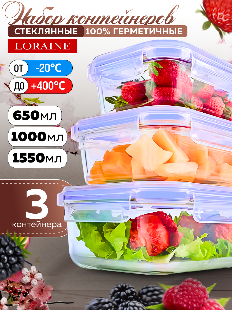 В наборе: 3 контейнера с крышками разного объема 650 мл, 1,0 л, 1,55 л.