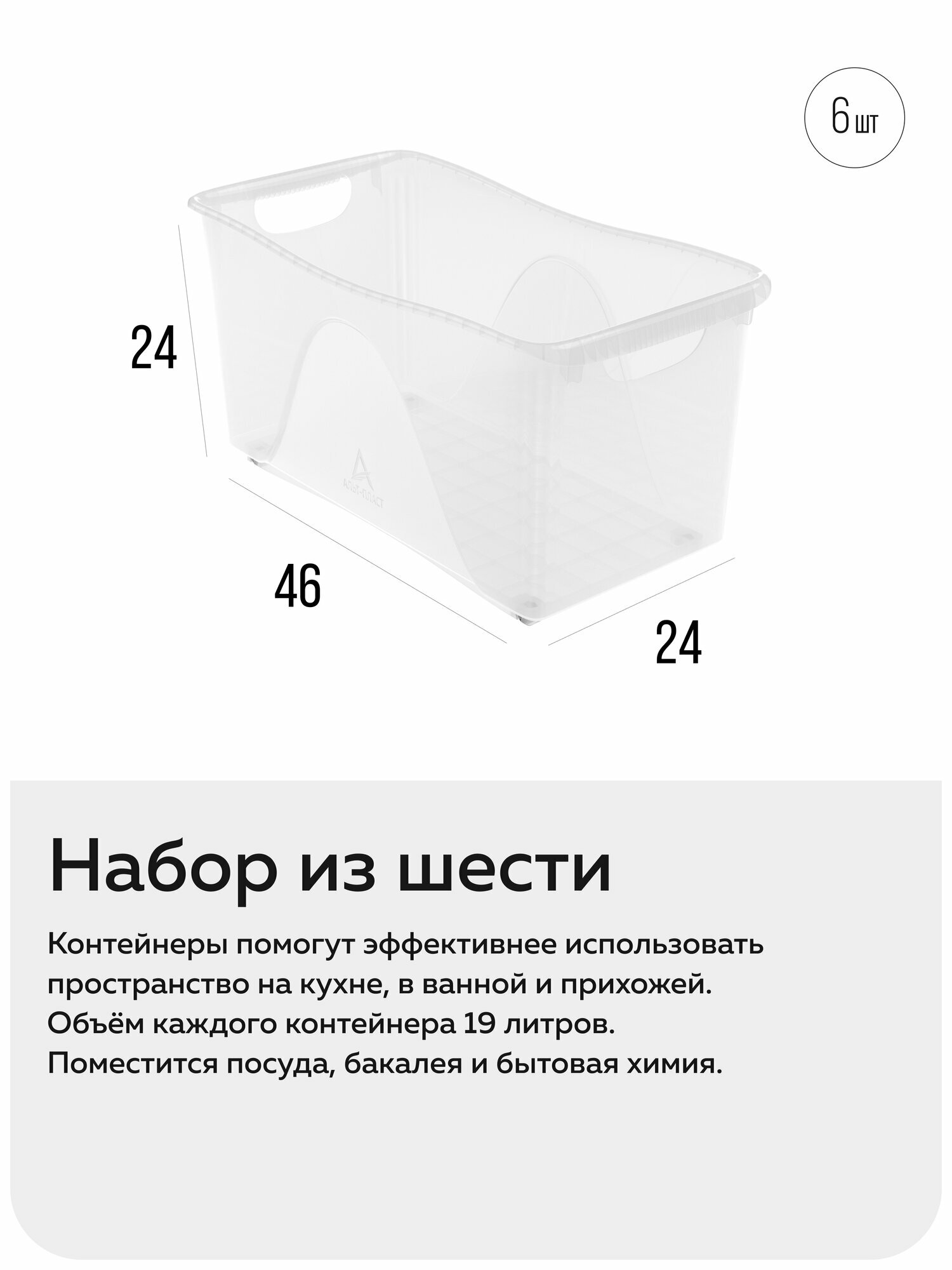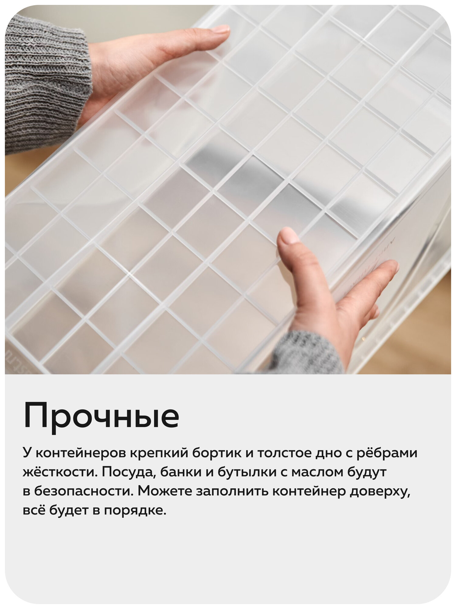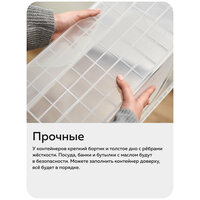 Пластиковый контейнер для хранения «Макс» прочный и надёжный. У него крепкий бортик и толстое дно с рёбрами жёсткости. Посуда и бутылки с маслом будут в безопасности: они не выпадут и не разобьются. Дно и стенки выдержат нагрузку — всё будет в порядке.
