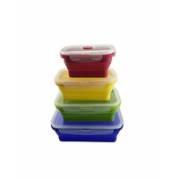 В наборе четыре контейнера с крышками на клипсах разных размеров и цветов. Каждый силиконовый ланч бокс складной, имеет крышку, которая герметично и равномерно закрывает контейнер благодаря силиконовому уплотнителю и фиксаторам. Контейнер для продуктов складной силиконовый благодаря гибкому корпусу легко складывается и экономит пространство. Специальный клапан для выпуска пара позволяет использовать силиконовые контейнеры с крышкой в микроволновой печи не снимая крышку. Складные силиконовые контейнеры выполнены из качественного пищевого силикона и выдерживают перепады температур от - 10 С до 110 С. Ланч-бокс можно использовать в микроволновой печи, холодильнике и морозильной камере.