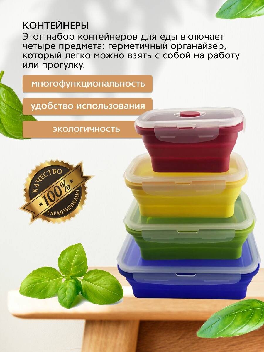 Ланч боксы для еды - контейнеры складные силиконовые набор из 4 штук - это идеальный выбор для любого, кто хочет вкусно поесть вне дома. Сделанные из высококачественного силикона, эти контейнеры для еды детские и для взрослых надежны и безопасны для использования, а благодаря своей складной конструкции, они очень легко хранятся и переносятся.