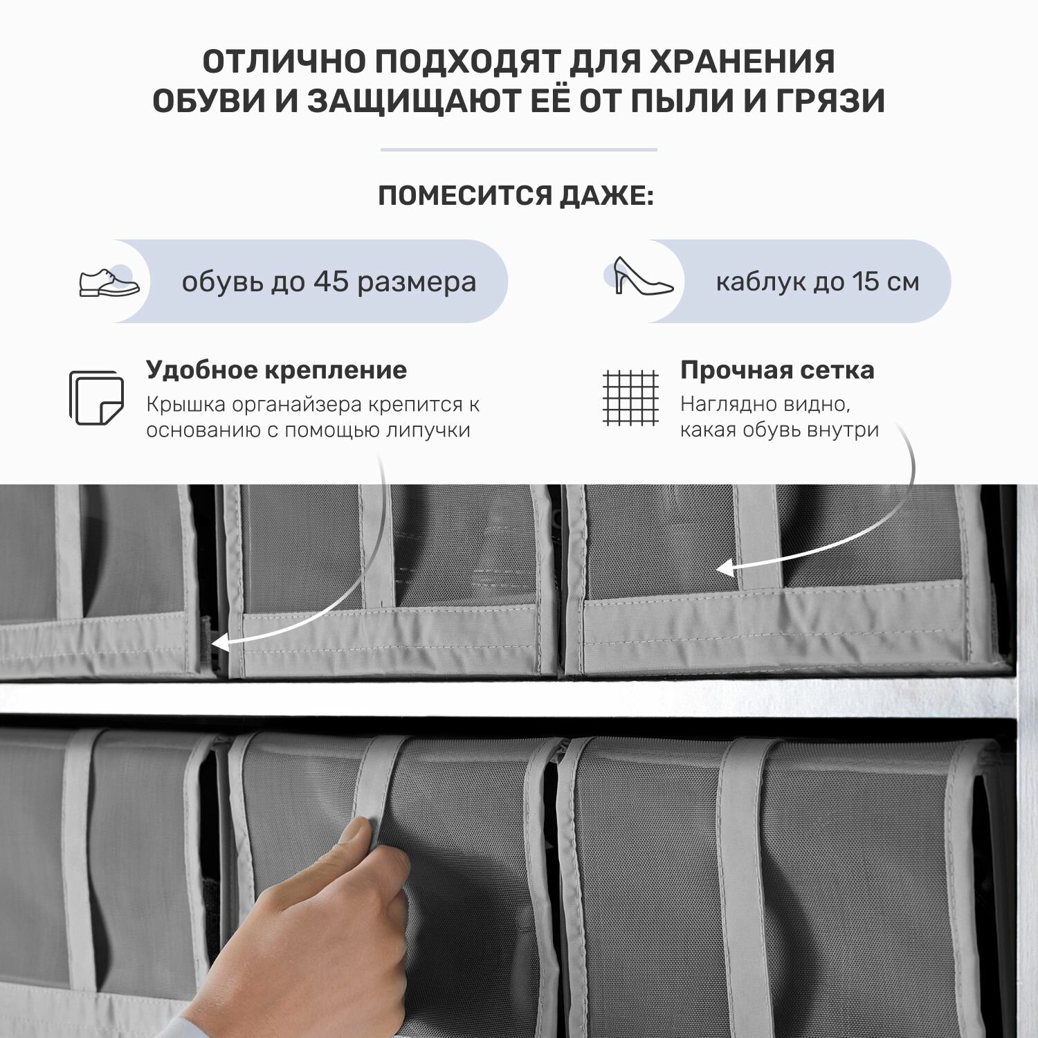 Одним из главных преимуществ нашего набора является крышка органайзера на липучке. Это позволяет легко открывать и закрывать коробки, не тратя время на застежки или защелки. Вы сможете быстро получить доступ к любимым моделям, не беспокоясь о их сохранности. Кроме того, Вы сможете увидеть содержимое органайзера для обуви, не доставая коробку. Это удобно, когда у вас много обуви, и вы хотите быстро выбрать нужную пару.