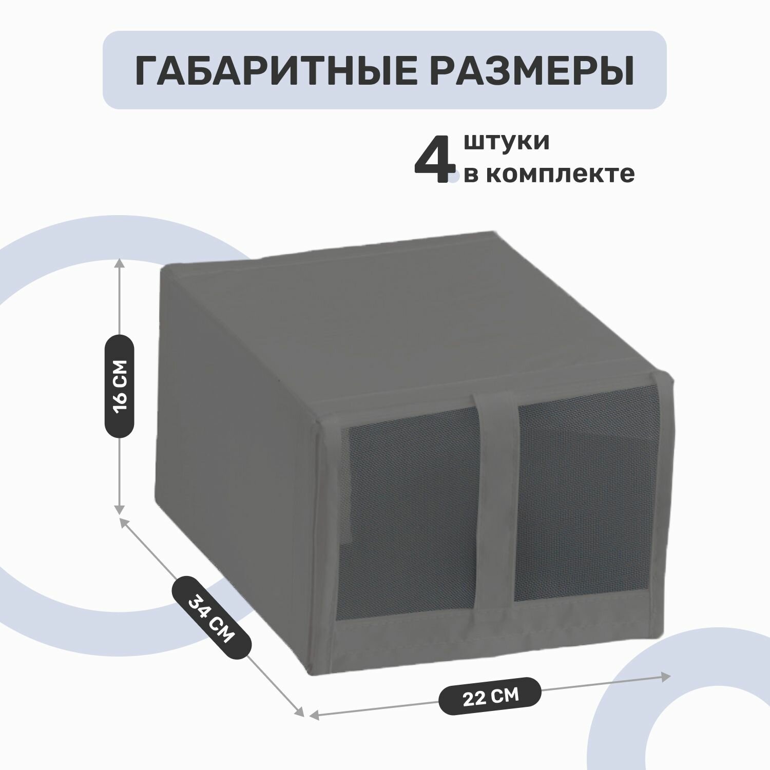 Размер каждой коробки составляет 22х34х16 см, что делает их достаточно вместительными для различных моделей обуви, включая кроссовки, туфли и сапоги. Набор органайзеров для хранения не только упрощает доступ к вашей обуви, но и защищает ее от пыли и повреждений. С помощью этого набора вы сможете легко поддерживать порядок в шкафу и находить нужную пару в считанные минуты.
