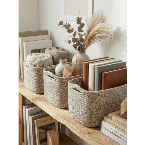 обратите внимание! Корзины поставляются В сложенном виде! Стильные и практичные корзины для хранения бренда "Taliso" решат проблемы хранения вещей в гостиной, ванной, детской, кухне и других помещениях вашего дома. Корзины плетеные для хранения служат предметом искусства и добавят уюта и станут приятным дополнением интерьера. Корзинки для хранения вещей изготовлены из 100% хлопковой веревки, что является экологичным материалом без каких-либо химикатов. Поэтому корзина для косметики подойдет для детской комнаты. Корзинки для мелочей и игрушек не царапает кожу ребенка, а также деревянный пол и стол, если вдруг маленькое чудо решит поиграть и с самой плетеной корзиной. В набор для хранения входят 3 корзиночки плетеные размерами: 22х7 см, 24х8 см, 25х9 см - это вместительные органайзеры для дома, которые позволяют убрать много вещей, занимая при этом совсем немного места. Поэтому корзинка для косметики это отличное средство для борьбы с беспорядком дома или на даче. Универсальная корзинка плетеная идеально подойдет для хранения различных мелочей, аксессуаров и ключей, а также для хранения вещей и в качестве корзины для фруктов или шкатулки для украшений, а также как органайзер для косметики. Корзина хлопковая так же идеально подходит в качестве декора для ванной и для хранения предметов рукоделия. Корзинки плетеные для хранения вещей представлены в нашем магазине в разных расцветках, поэтому Вы без труда сможете подобрать нужный оттенок и размер, который отлично впишется в ваш интерьер. Плетеная корзина, словно сошедшая со страниц Pinterest, добавит уюта и стиля вашему дому. Обратите внимание! Корзинки плетеные для косметики поставляется в сложенном виде. Для восстановления формы рекомендуется набор корзин для ванной отпарить утюгом, предварительно опрыскав водой. Очень стильные и долговечные плетеные корзины для кухни, придадут уют вашему дому и будут непременно радовать взор!