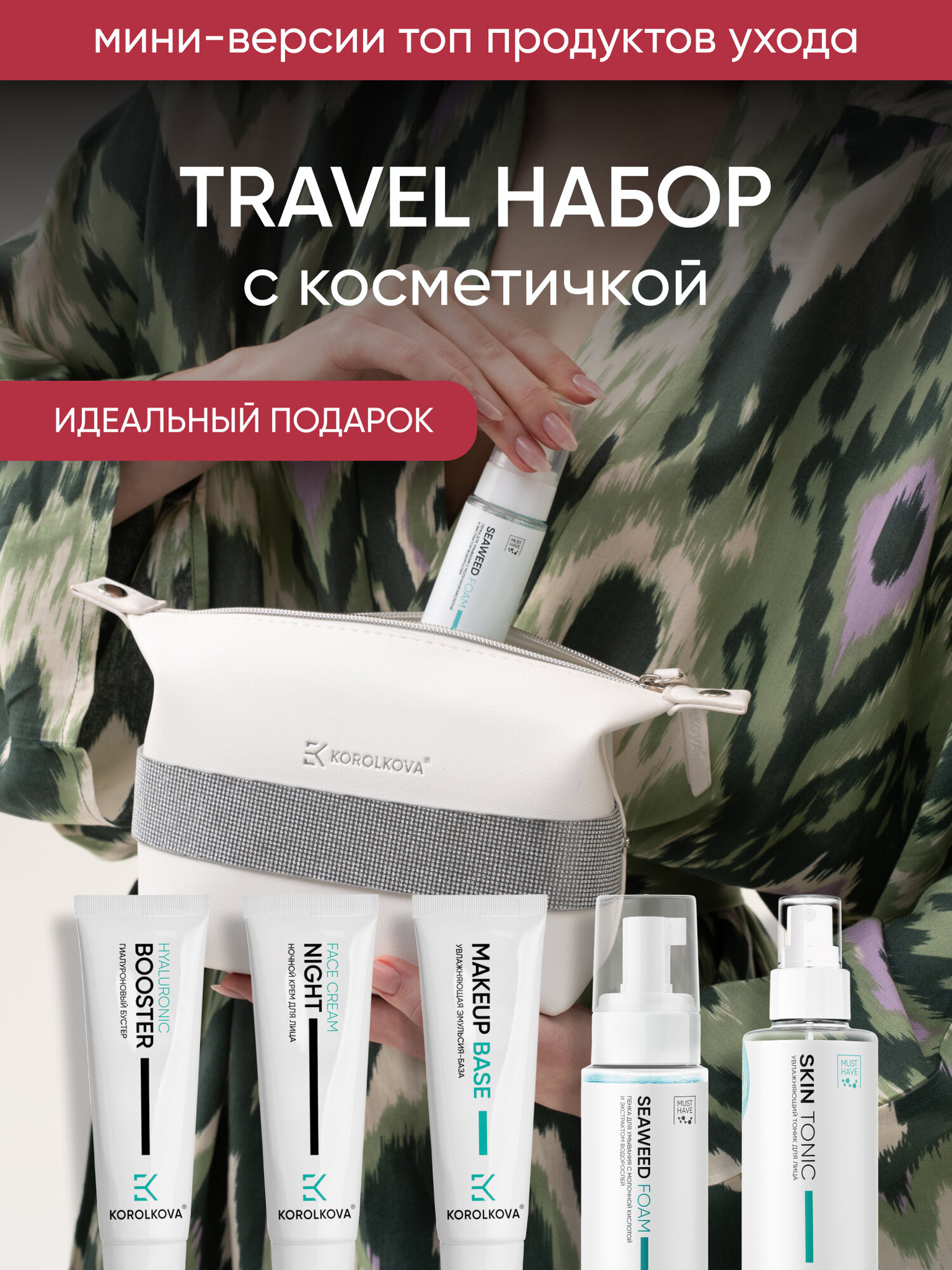 Представляем уникальный дорожный набор косметики — идеальный спутник для женщин, которые ценят комфорт и заботу о себе. В брендированной косметичке от Korolkova вы найдете исключительные средства, созданные специально для того, чтобы ваша кожа оставалась молодой и красивой даже в самых напряженных условиях.
