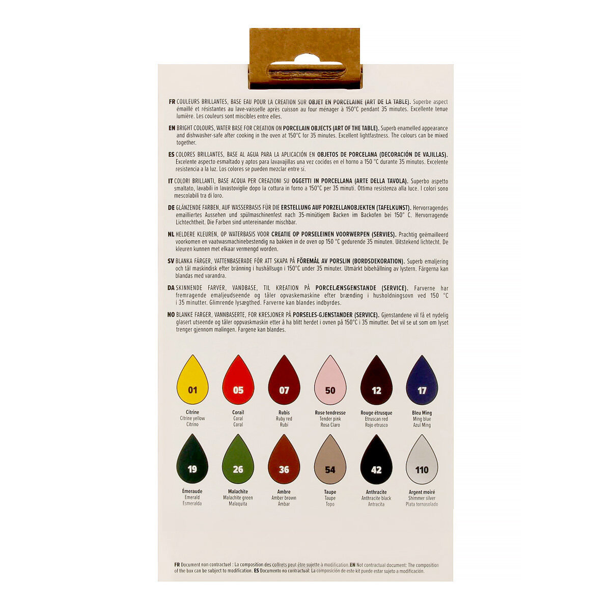 Набор №1 757471 Исследование Porcelaine 150 глянцевые краски 12 х 20 мл: слоновая кость, желтый Марсельский, агат, алый, розовый опал, фуксия, Пармский фиолетовый, бирюзовый, сапфир, бронза, антрацит, золото Набор №2 757472 Исследование Porcelaine 150 глянцевые карски 12 х 20 мл: лимонный, коралловый, рубиновый, розовый опал, красный этрусский, синий, изумрудный, малахит, янтарный, серо-коричневый, антрацит, серебро Краски Porcelaine 150 наносятся на фарфор, фаянс, также на другие поверхности, способные выдержать температуру обжига 150°C. Выбор поверхности и инструментов позволяет разнообразить эффекты, прозрачность, интенсивность цвета. Краски Porcelaine 150 имеют вид профессиональной эмали после простого обжига в бытовом духовом шкафу при 150°C. свойства: Насыщенные и яркие краски, прозрачные или непрозрачные имеют вид эмали после обжига. Обладают великолепной светостойкостью. Смешивание красок: Краски смешиваются друг с другом. Время высыхания: Поверхностное – несколько минут. Полное – минимум 24 часа. Обжиг всех изделий с красками и вспомогательными материалами: 35 минут при температуре 150°C в бытовом духовом шкафу через 24 часов после нанесения краски. Для маркеров: время высыхания 72 часа, мыть аккуратно без замачивания. Поверхности: Фарфор, фаянс, керамика. поверхности « Pyrex » или аналоги не могут быть использованы. Разбавление: Разбавитель Porcelaine 150. Укрывистость: Краски непрозрачные, полупрозрачные и прозрачные.