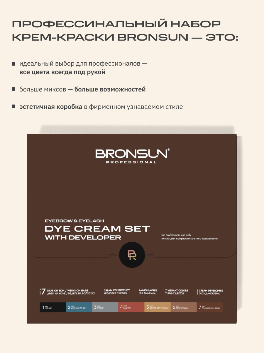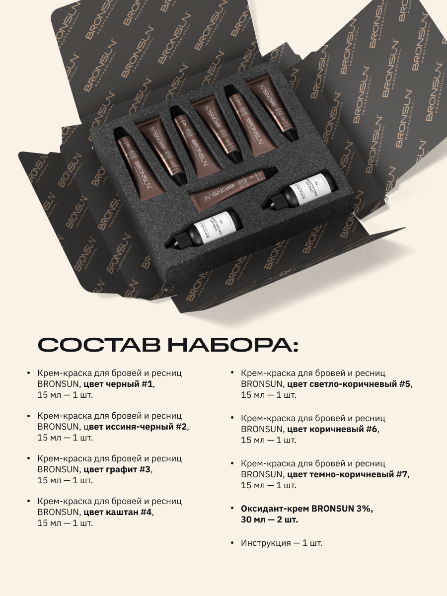 Крем-краска для бровей и ресниц BRONSUN, цвет черный #1, 15 мл. СОСТАВ (INCI): Water, Сetearyl alcohol, Сeteareth-20, Sodium Hydroxide, Sodium Sulfite, Carbomer, Hydrolyzed Silk, Hydrolyzed Keratin, Tocopheryl Acetate, P-Phenylenediamine, Resorcinol, p-Aminophenol, m-Aminophenol. Крем-краска для бровей и ресниц BRONSUN, цвет иссиня-черный #2, 15 мл. СОСТАВ (INCI): Water, Сetearyl alcohol, Сeteareth-20, Sodium Hydroxide, Sodium Sulfite, Carbomer, Hydrolyzed Silk, Hydrolyzed Keratin, Tocopheryl Acetate, P-Phenylenediamine, Resorcinol, p-Aminophenol, m-Aminophenol. Крем-краска для бровей и ресниц BRONSUN, цвет графит #3, 15 мл. СОСТАВ (INCI): Water, Сetearyl alcohol, Сeteareth-20, Sodium Hydroxide, Sodium Sulfite, Carbomer, Hydrolyzed Silk, Hydrolyzed Keratin, Tocopheryl Acetate, P-Phenylenediamine, Resorcinol, p-Aminophenol, m-Aminophenol. Крем-краска для бровей и ресниц BRONSUN, цвет каштан #4, 15 мл. СОСТАВ (INCI): Water, Сetearyl alcohol, Сeteareth-20, Sodium Hydroxide, Sodium Sulfite, Carbomer, Hydrolyzed Silk, Hydrolyzed Keratin, Tocopheryl Acetate, P-Phenylenediamine, Resorcinol, p-Aminophenol, m-Aminophenol. Крем-краска для бровей и ресниц BRONSUN, цвет светло-коричневый #5, 15 мл. СОСТАВ (INCI): Water, Сetearyl alcohol, Сeteareth-20, Sodium Hydroxide, Sodium Sulfite, Carbomer, Hydrolyzed Silk, Hydrolyzed Keratin, Tocopheryl Acetate, P-Phenylenediamine, Resorcinol, p-Aminophenol, m-Aminophenol. Крем-краска для бровей и ресниц BRONSUN, цвет коричневый #6, 15 мл. СОСТАВ (INCI): Water, Сetearyl alcohol, Сeteareth-20, Sodium Hydroxide, Sodium Sulfite, Carbomer, Hydrolyzed Silk, Hydrolyzed Keratin, Tocopheryl Acetate, P-Phenylenediamine, Resorcinol, p-Aminophenol, m-Aminophenol. Крем-краска для бровей и ресниц BRONSUN, цвет темно-коричневый #7, 15 мл. СОСТАВ (INCI): Water, Сetearyl alcohol, Сeteareth-20, Sodium Hydroxide, Sodium Sulfite, Carbomer, Hydrolyzed Silk, Hydrolyzed Keratin, Tocopheryl Acetate, P-Phenylenediamine, Resorcinol, p-Aminophenol, m-Aminophenol. Оксидант-молочко BRONSUN 3%, 20мл. СОСТАВ (INCI): Water, Hydrogen Peroxide, Cetearyl Alcohol, Ceteareth-20, Phosphoric acid, Tetrasodium Pyrophosphate, Sodium Stannate.