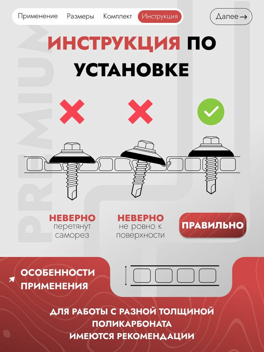 - Саморезы по металлу! Пожалуйста, не заказывайте, если Вам нужно прикручивать поликарбонат к дереву, они не подходят, что бы не приходилось потом делать возвраты. Спасибо!
