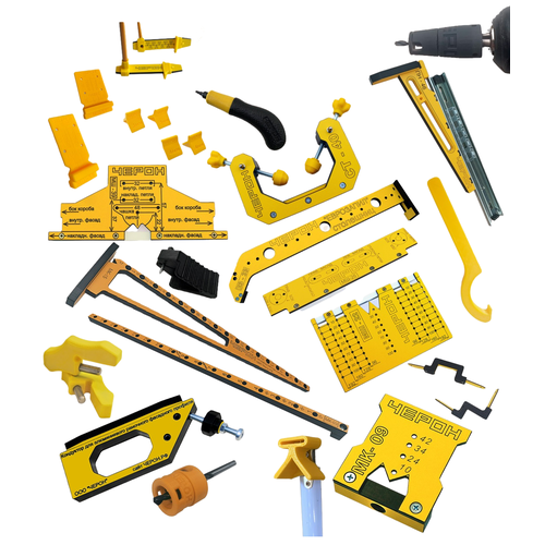 Набор кондукторов для сборки кухонной мебели своими руками представляет собой комплект инструментов и шаблонов, которые значительно облегчают процесс сборки и установки мебельных элементов. Набор включает в себя следующие товары: