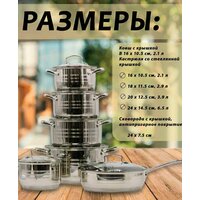 Набор включает в себя 4 кастрюли разного объема, сковороду с высокими бортиками и сотейник. Это позволяет готовить разнообразные блюда на любой вкус, экономно используя жидкость и сохраняя ароматы блюд.