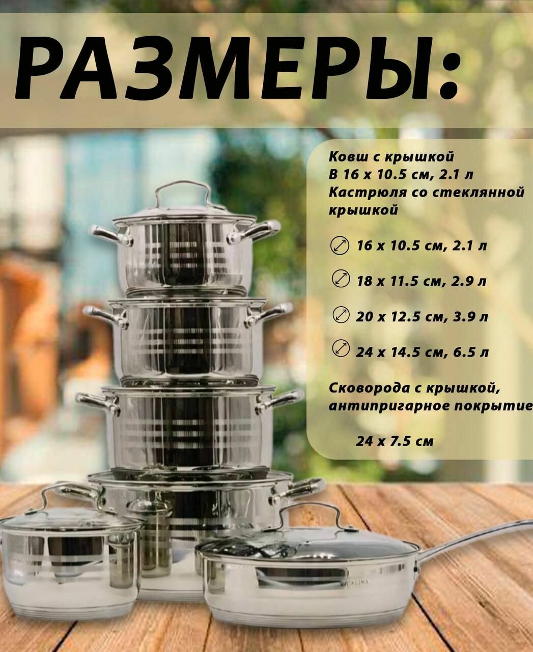 В комплекте вы получаете 12 предметов, включая 4 кастрюли, 1 сотейник и 1 сковороду, а также 6 крышек.