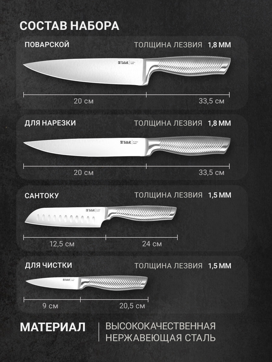 | Состав набора ножей | нож для овощей, нож для томатов, нож для хлеба, нож сантоку, разделочный нож, универсальный нож, филейный нож, шеф-нож |