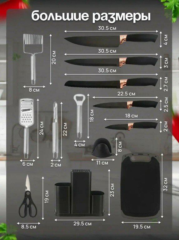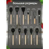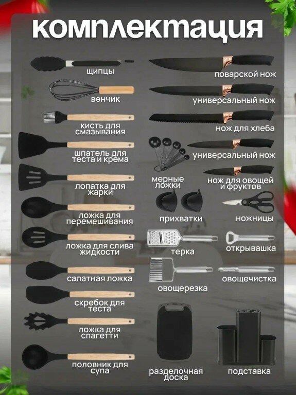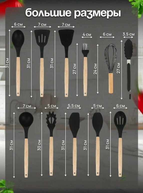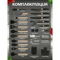 лопатка для жарки, венчик, шпатель, щипцы, лопатка с отверстиями для слива масла, половник, ложка для выпечки, кисточка для масла, дуршлаг для спагетти, открывашка, шумовка, подставка
