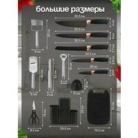 Набор кухонных принадлежностей – это один из самых необходимых аксессуаров на кухне. В этот красивый кухонный набор принадлежностей входит 29 предметов + разделочная доска в подарок. Значит вы получите 30 предметов: 29 кухонных принадлежностей высокого качества и 1 кухонную подставку. Вы обретете 29 составляющих, выполненных из натурального бамбука и высококачественного силикона. Вы найдете: лопатку для жарки, венчик, шпатель, щипцы, лопатку с отверстиями для слива масла, половник, ложку для выпечки, кисточку для масла, дуршлаг для спагетти, открывашка и шумовку. Каждый имеет комфортную длину от 25 до 34 см. Как приложение к этому, комплект включает удобную подставку из пластика! Деревянные элементы изготовлены из экологически чистого бамбука, который зарекомендовал себя как один из самых прочных и долговечных материалов для кухонной утвари. Силиконовые части не впитывают цвета и ароматы, не царапают посуду и безопасны при контакте с пищевыми продуктами. Набор приборов графитового цвета будет сочетаться с любым дизайном, придавая вашему пространству элегантность и стиль. Ваши гости и домочадцы непременно оценят ваш выбор. Металлические детали сделаны из нержавеющей стали, что гарантирует их долгий срок службы и устойчивость к коррозии. Части из дерева прекрасно дополняют металлические, придавая эстетичный и современный вид. Отныне приготовление еды станет не только проще, но и более приятным! Это замечательное решение для организации пространства, все принадлежности будут всегда под рукой. Продукция нашего бренда отличается превосходным качеством и долговечностью. Все предметы из силикона обладают антипригарным покрытием, выдерживают высокие температурные нагрузки и абсолютно безвредны для здоровья. Для сохранения внешнего вида, мы рекомендуем избегать мойки в посудомоечной машине. Перед первым использованием рекомендуется хорошо промыть все элементы с моющим средством под краном, чтобы устранить заводской запах.