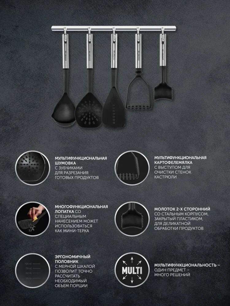 Набор кухонных принадлежностей Accent-5SN / половник, лопатка, шумовка, толкушка, кухонный молоток / Черный: сравнение цен, характеристики, фото, актуальное наличие и цены.