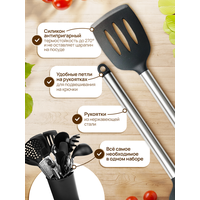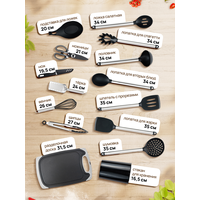 поварской нож, нож для хлеба, нож для нарезки, универсальный нож, поварской нож, щипцы; шпатель для теста и крема, лопатка для жарки, половник для супа, скребок для теста; кисть для смазывания, разделочная доска, ложка для перемешивания, ложка для слива жидкости; ложка для спагетти, салатная ложка, венчик; ножницы для разделки птицы и подставка для кухонных принадлежностей