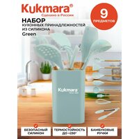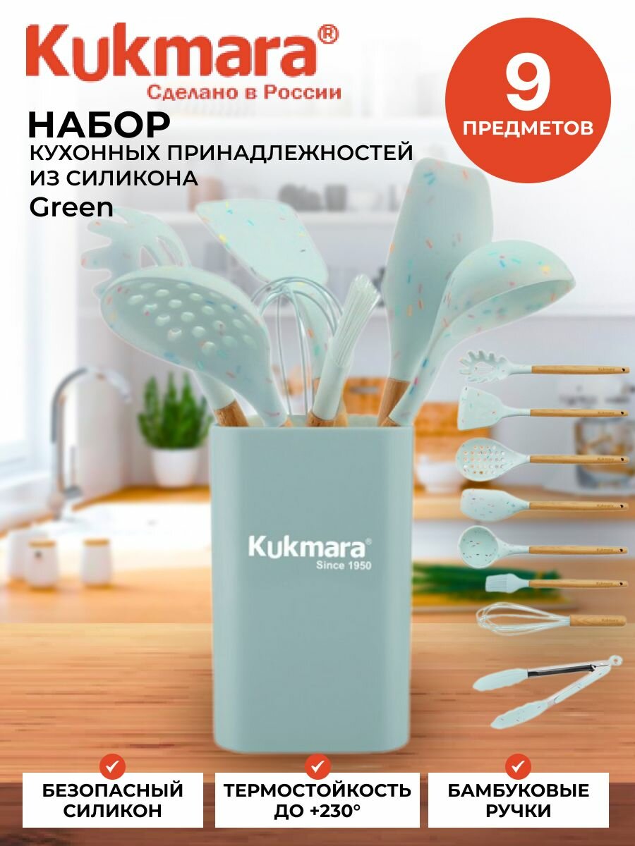 Набор брендированных кухонных принадлежностей «KUKMARA» из силикона состоит из 9 предметов (лопатка, лопатка кондитерская, половник, шумовка, ложка для спагетти, венчик, кисть, щипцы, универсальный лоток). Красивый и удобный набор кухонных принадлежностей станет вашим незаменимым помощником. Прекрасно подойдет в качестве подарка для любителей готовить.
