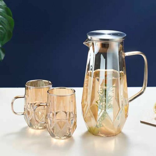 Набор стаканов 4 штуки и кувшин представляет собой идеальное решение для тех, кто ценит комфорт и практичность в повседневной жизни. Изготовленный из термостойкого стекла с гальваническим покрытием, этот набор обеспечивает долговечность и легкость в использовании. Он идеально подходит для использования в домашних условиях или как подарки для близких и коллег. Графин с крышкой объемом 1,4 л. Каждый стакан объемом 300 мл, оснащен ручками, что делает их удобными в использовании. Этот набор станет отличным дополнением к вашей кухонной утвари, обеспечивая удобство и стиль в любой ситуации. Графин со стаканами — стильный и практичный набор для подачи прохладительных напитков. В комплект входят 4 стакана из того же материала, который идеально дополняют дизайн графина. Набор станет украшением вашего стола и создаст уютную атмосферу во время семейных обедов или встреч с друзьями. Прозрачное стекло позволяет оценить красоту напитков, а удобная ручка графина обеспечивает комфортный захват.