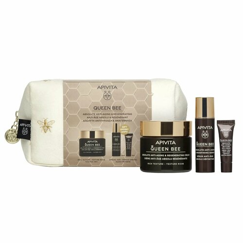 В набор Квин Би входят три средства в косметичке: Комплексный антивозрастной регенерирующий крем с насыщенной текстурой 50 мл Комплексный уход обеспечивает эффект лифтинга, придает коже упругость и сияние, разглаживает морщины, увлажняет и выравнивает цвет лица. Содержит греческое маточное молочко с уникальными свойствами и высокую концентрацию растительных экстрактов, благодаря чему эффективно воздействует на все признаки старения. Комплексная антивозрастная сыворотка 10 мл Является интенсивным средство ухода и эффективно воздействует на все признаки старения благодаря высокой концентрации греческого маточного молочка и растительных экстрактов. В результате морщины выглядят разглаженными, контур лица становится более четким, кожа более увлажненная, а цвет лица более ровный. Комплексный антивозрастной восстанавливающий крем для век 2 мл Разглаживает морщины, устраняет темные круги под глазами и следы усталости, увлажняет кожу, придает ей упругость и сияние. Эффективно воздействует на все признаки старения благодаря уникальным свойствам греческого маточного молочка. Применение: Крем для лица: наносить ежедневно мягкими круговыми движениями на очищенную кожу лица и шеи. Сыворотка: наносить утром и вечером подушечками пальцев на очищенную кожу лица и шеи перед применением Комплексного ухода Квин Би. Избегать области вокруг глаз. Крем для век: наносить утром и вечером мягкими похлопывающими движениями на очищенную кожу вокруг глаз. Активы: Крем для лица: маточное молочко, экстракт анигозантоса и эдельвейса, сквалан, оливковое масло, пчелиный воск, пантенол. Сыворотка: маточное молочко, экстракт зизифуса, экстракт ладанника, экстракт прополиса, эфирные масла розы и мирры. Крем для век: маточное молочко, масло ши, оливковое масло, сквалан, пчелиный воск, настой шиповника.