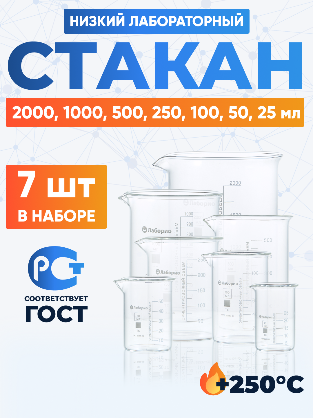 Набор лабораторных стаканов 2000, 1000, 500, 250, 100, 50, 25 мл (тип Н, низкий с делениями и носиком, термостойкий): сравнение цен, характеристики, фото, актуальное наличие и цены.