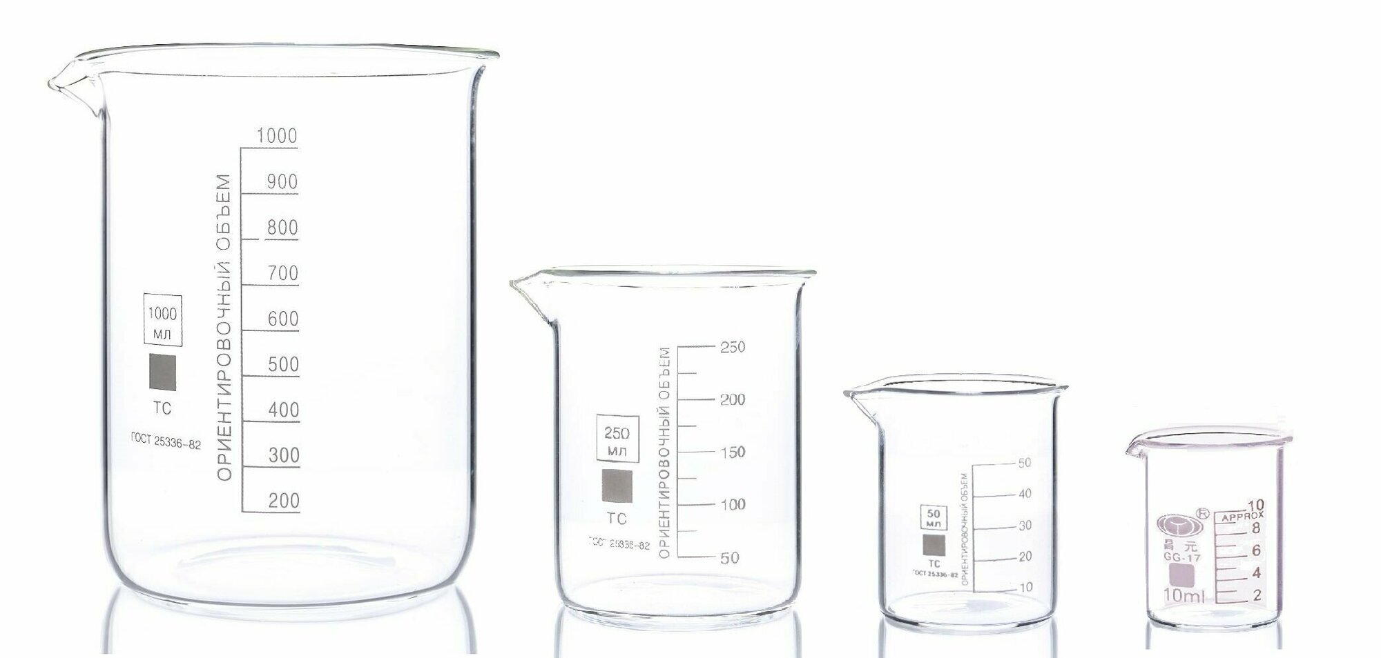 Набор лабораторных стаканов 1000, 250, 50, 10 мл (тип Н, низкий с делениями и носиком, термостойкий): сравнение цен, характеристики, фото, актуальное наличие и цены.