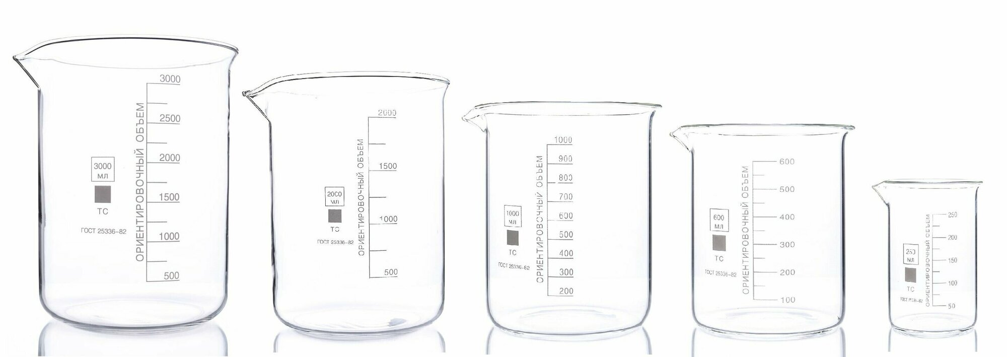 Набор из пяти низких лабораторных стаканов Н-1-3000, Н-1-2000, Н-1-1000, Н-1-600 и Н-1-250. Объемами 3000 мл, 2000 мл, 1000 мл, 600 мл и 250 мл соответственно.