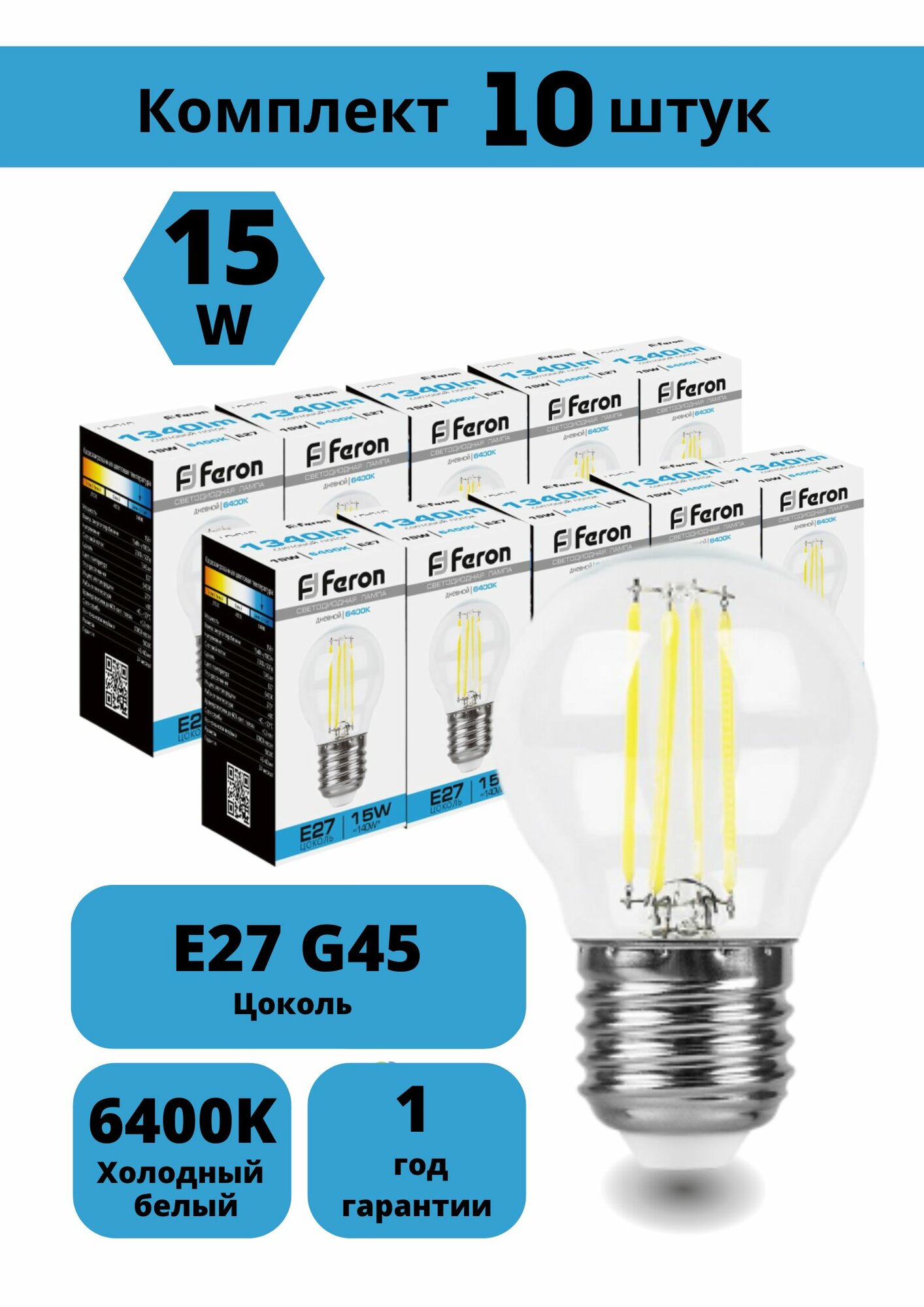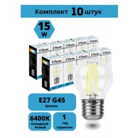 Набор ламп светодиодный Feron LB-515 шарик G45 филамент E27 15W 230V 6400K — 10шт, угол рассеивания 270 , 75*45мм: сравнение цен, характеристики, фото, актуальное наличие и цены.