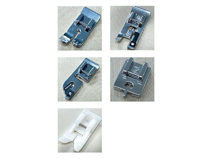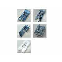 - лапка для потайной молнии, которая поможет незаметно втачать молнию максимально близко к зубцам, отодвигая их перед иглой - прямострочная лапка для деликатных, тонких, трикотажных тканей ( только для прямой строчки) - тефлоновая лапка для работы с кожей, замшей, винилом; поверхность из специального полимера позволяет с легкостью скользить по сложным матералам, не прилипая к ним - оверлочная лапка для обработки края ткани; направляющие на лапке помогают управлять подачей ткани и предотвращают деформацию ткани - лапка-подрубатель для узких швов 2 мм Упаковка - коробка Количество - 5 штук Производство - Тайвань