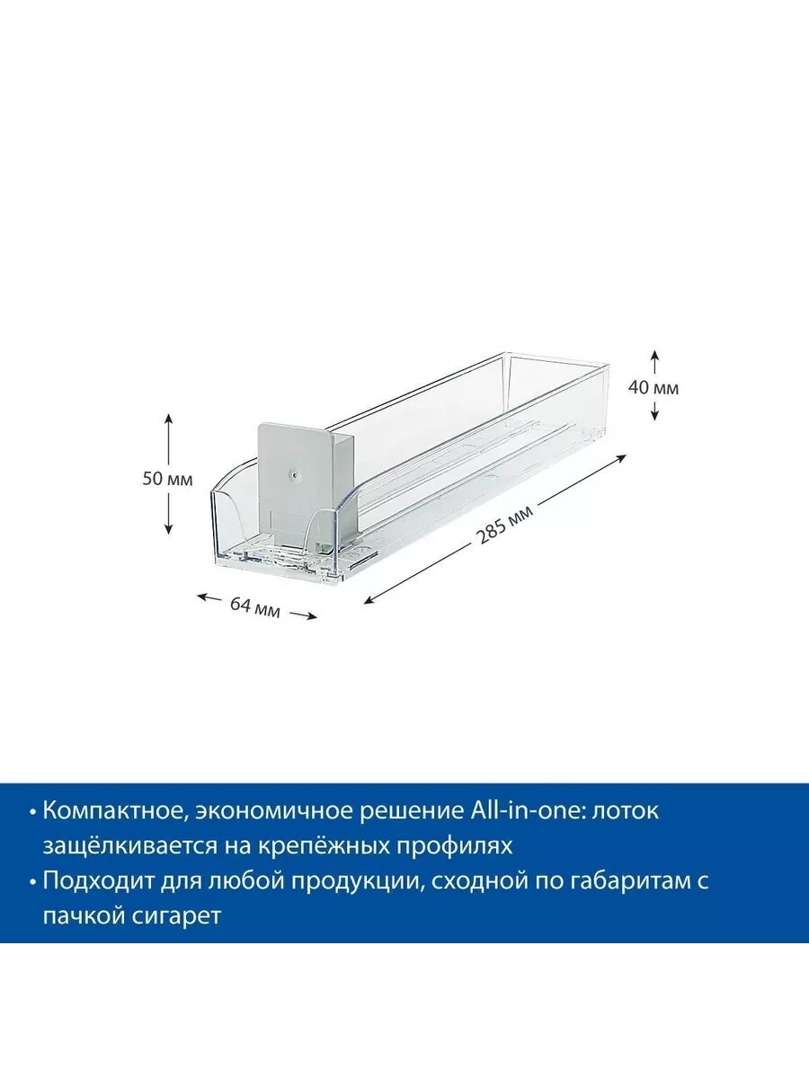 Лоток для сигарет SIG-TRAY, длина 285 мм, сила толкания 3NСигаретный лоток является готовым решением для выкладки сигарет в сигаретных шкафах глубиной не менее 285 мм. Лоток оснащен толкателем, который двигает пачки с табачной продукцией к краю шкафа до окончания товара в нем. Это позволяет контролировать наличие товара и упрощает его подачу. Может использоваться не только с сигаретными пачками, но и с любым товаром, подходящим по габаритам. Прост в использовании. Устанавливается на крепежные профили, которые приобретаются отдельно.