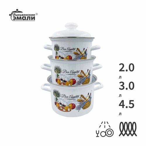 | Подробная комплектация | 3 кастрюли: 1.5 л, 2 л, 3 л; 3 крышки |