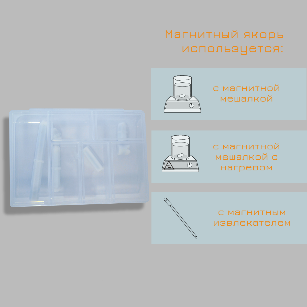 Для использования необходимо поместить якорь в ёмкость с жидкостью, которая находится на магнитной мешалке.