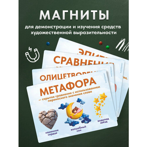 Набор для доски «Средства художественной выразительности» - это 4 ярких, ламинированных магнита формата A4, созданных специально для учителей начальных классов, а также учителей русского и литературы. В наборе: сравнение, эпитет, олицетворение и метафора. На каждом магните имеется определение, понятный пример, а также сопровождающая иллюстрация, которая помогает детям визуально воспринимать и запоминать материал.