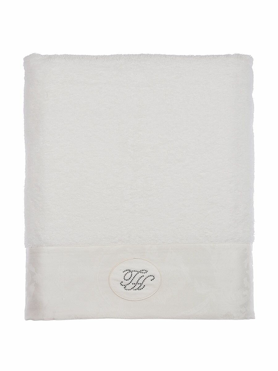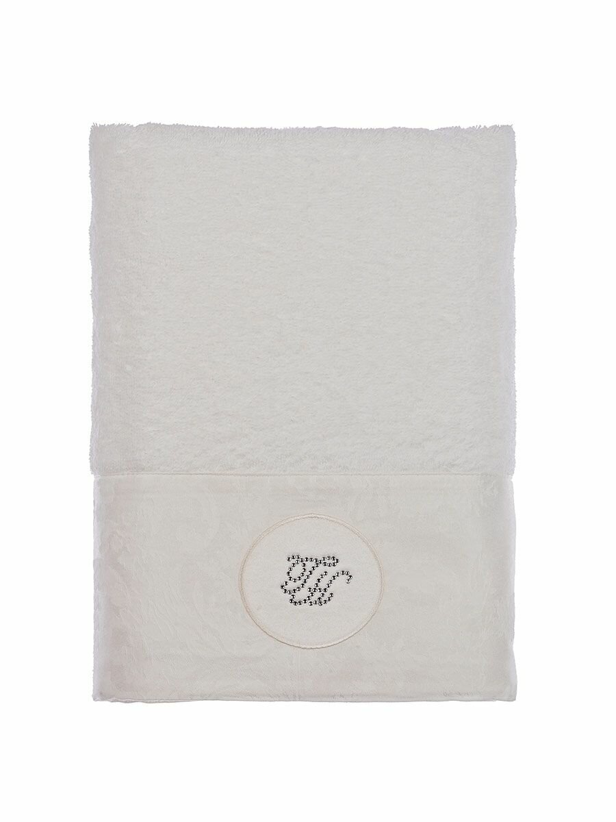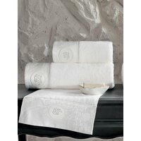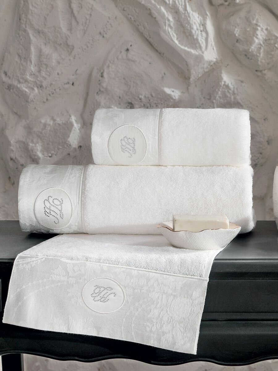 Набор полотенец выполнен в белом цвете с декоративной отделкой кантом и стразами, что придает ему элегантный и современный вид.