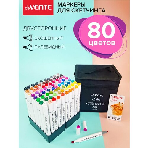 Набор профессиональных маркеров для скетчинга deVENTE. Slim имеет 80 ярких цвета. С одной стороны маркера классическое скошенное долото шириной 6 мм, с другой стороны - пулевидный наконечник шириной 1 мм. Маркер имеет эргономичный трёхгранный корпус. Его удобно держать в руках, а благодаря форме, он не перекатывается по столу, сохраняя порядок на рабочем месте художника. Чернила на спиртовой основе нетоксичны и не портят поверхность бумаги в отличие от маркеров на водной основе. В маркерах используется изопропиловый спирт - безопасный используемый в медицине косметике парфюмерии. Кроме того, спиртовые чернила обеспечивают создание плавного градиента и отсутствие выраженных полос. Этот эффект достигается благодаря маркеру-блендеру, входящему в набор. Срок годности 24 месяца. Прекрасный инструмент для любого творчества скетчей рисования комиксов граффити манга раскрасок скрапбукинга декоративных открыток раскрасок-антистресс леттеринга и др. Эскизы данными маркерами быстро высыхают на бумаге и становятся водостойкими бескислотными. Маркер перезаправляемый. Спиртовой маркер подходит для использования на бумаге картоне фотографиях пластике, дереве, ткани, холсте. подойдут как профессионалам, так и начинающим. Набор поставляется в текстильной сумке на молнии с ручкой для переноски. Каждый маркер располагается в подставке вертикально благодаря пластиковой подставке внутри сумки.