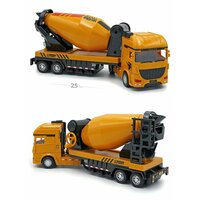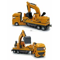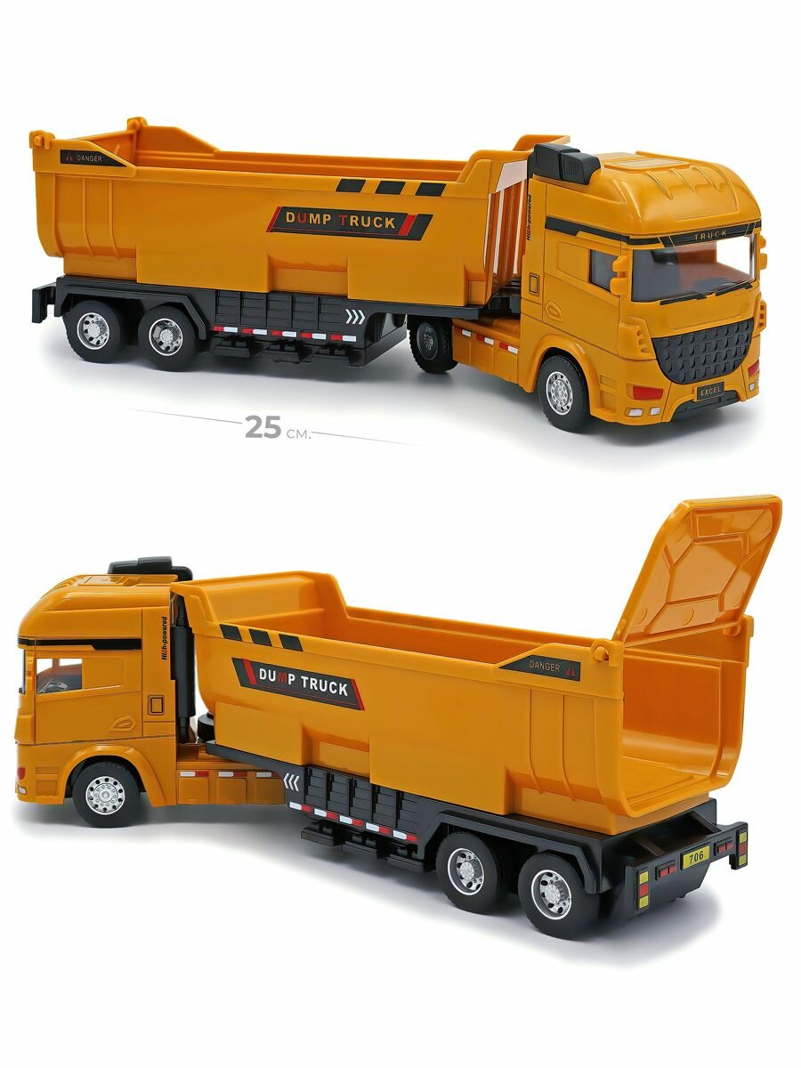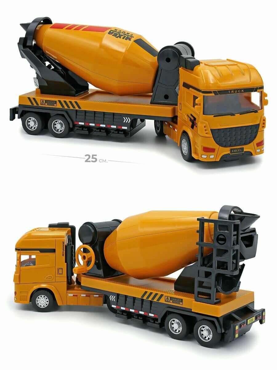 Набор фур тягачей с прицепами экскаватор, грузовик и бетономешалка в одном комплекте. Реалистичные машинки грузовики с разными прицепами строительной тематики в одном комплекте — это отличный подарок, который придется по душе вашему ребенку. Машинки имеют встроенный инерционный привод, прорезиненные колеса и функциональные прицепы. Бетономешалка спецтехника игрушка для перевозки бетона. с желтой кабиной и желтым прицепом на прицепе. Сам миксер бетономешалки хорошо проработан и функционален, Миксер крутиться. Проработаны различные лесенки на прицепе, как настоящие. Машина грузовик с прицепом для перевозки сыпучих грузов. Желтый тягач, с желтым прицепом. Прицеп на подвижном шарнирном механизме как настоящий. На прицепе проработаны элементы дизайна, а сам кузов можно наполнить. Задний борт у кузова открывается и туда можно что-то насыпать. Самый функциональный представитель этого комплекта строительной техники, это машинка с экскаватором, она представляет собой тягач желтого цвета с прицепом на шарнире. Экскаватор поворачивается вокруг своей оси, стрела с ковшом опускается и поднимается для реалистично и интересной игры. Машины с прицепом, это набор, который отличается своей наполненностью он поможет ребенку развить фантазию и моделировать различные сцены игр.