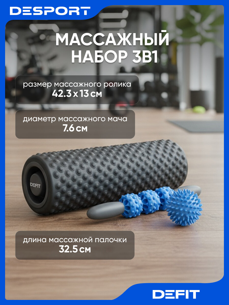 Массажный набор Defit 300 3-в-1 — универсальный набор для самомассажа после тренировки. В комплект входят массажный ролик, массажный мяч и массажная палочка, позволяющие проработать мышцы спины, ног, ягодиц, плечевого пояса. Такой массажный набор для фитнеса помогает ускорить восстановление, снять мышечное напряжение после бега, силовой тренировки, кроссфита. Ролик для миофасциального массажа, массажный мяч и роликовый массажёр можно использовать дома, в спортзале, брать с собой в поездки. Если вы ищете массажный набор для спортсмена, аксессуары для реабилитации, товары для здоровья и спорта, Defit 300 станет удобным решением. Desport — официальный дистрибьютор Декатлон / Decathlon в России.