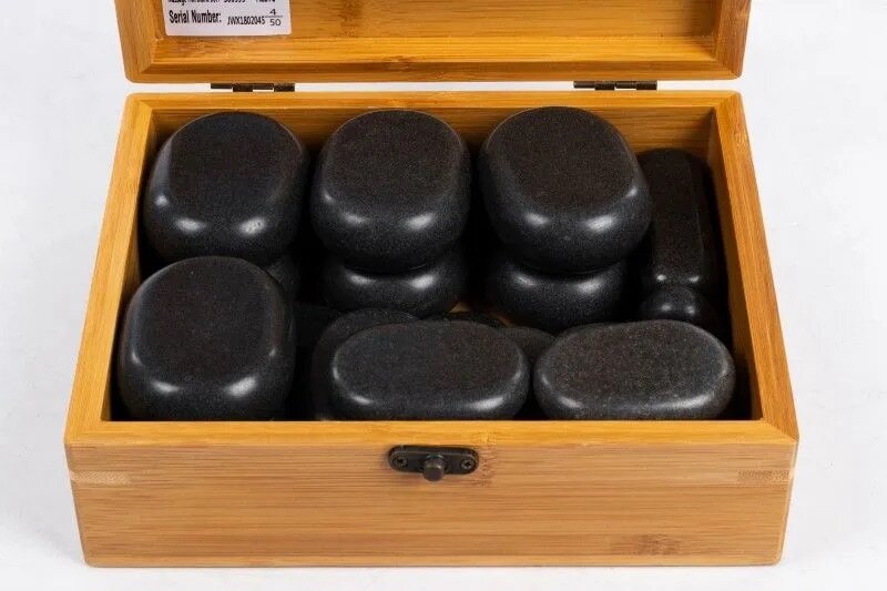 Профессиональный набор массажных камней в бамбуковой коробке.