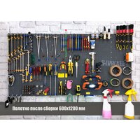 В комплекте 12 оснований размером 200х300х10 мм чёрного цвета. Держатели: Держатель для бит 5/16 и головок 1/2 - 40 штук Держатель головок 1/4 - 40 штук Держатель для бит 1/4 - 30 штук Крючок большой - 20 штук Крючок малый - 200 штук Крючок XL - 10 штук Держатель магнитный - 10 штук Держатель для лотка - 10 штук Маркировочная табличка (желтый) - 40 штук Ящик для метизов - 4 штуки Наклейки для маркировки - 1 комплект Держатель универсальный "Гвоздик" - 60 штук Размер полотна после сборки: 120х60 см
