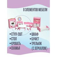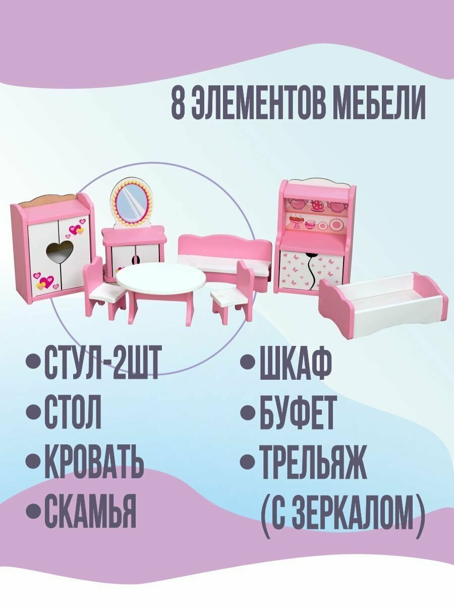 Набор мебели для кукол, комплект детской мебели. Мебель выполнена из качественного дерева МДФ изготовлена из безопасных качественных материалов. Набор мебели для кукол подходит для сюжетно-ролевой игры в дочки-матери. Такие игры позволяют ребенку проявить свою фантазию, аккуратность, познакомиться с понятиями ответственности и заботы, развить мелкую моторику рук и почувствовать себя в роли заботливой мамы. Поставляется в разобранном виде, прилагается инструкция по сборке. Мебель легко собирается.