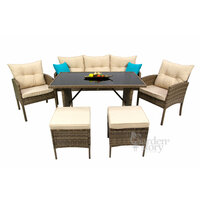 Каркас мебели выполнен из стали, а поверхность из искусственного ротанга и стекла, что придает мебели устойчивость к воздействию погодных условий. Водоотталкивающая обивка из текстиля делает мебель удобной в использовании и легкой в уходе.