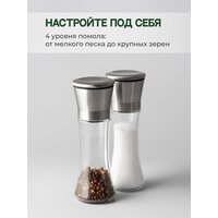 Удобная современная механическая сольница для специй и пряностей упрощает жизнь каждой хозяйке! В мельнице для специй удобно хранить, а при необходимости измельчить любые специи, регулируя степень помола (4 уровня). Благодаря перечнице и солонке для кухни свежемолотые специи придадут Вашему блюду особый аромат и насыщенный вкус. Перцемолка имеет ударопрочный корпус и стильный дизайн, поэтому баночка для специй долго прослужит и впишется в любой кухонный интерьер. Механизм прозрачной мельницы для перца, выполненный из керамики, легко перемалывает любые специи. Процесс помола дробилкой для приправ происходит без лишней грязи, пыли и крошек. Практичный корпус посуды позволяет контролировать остаток специй и сохранять герметичность, предотвращая высыпание специй. Измельчитель кухонный для перца и соли удобно лежит в руке. Благодаря механической мельнице Вы сможете подчеркнуть блюдо свежемолотыми специями. Набор мельниц для специй (2 шт, 180 мл) станет отличным подарком для любой хозяйки!