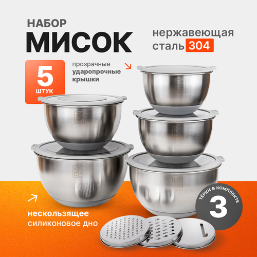 Набор мисок из нержавеющей стали с крышками и терками в комплекте. Миски: 16 см - 1л; 18 см - 2л; 20 см - 2,5л; 22 см - 3л; 24 см - 4,5л. Толщина стенки всех мисок - 0,5 мм. Благодаря мискам можно приготовить прекрасный ужин, смешать легкий салат, взбить тесто или замариновать шашлык. А крышка прикроет пищу находящуюся в ёмкости. В больших мисках крышки имеют отверстие, что помогает не испачкать все вокруг, во время взбивания ингредиентов. А также, для использования терок, входящих в комплект: для сыра, огурца, моркови и т.д. Дно покрыто силиконом, что препятствует скольжению и обеспечивает устойчивость. На внутреннюю стенку каждой миски нанесена мерная шкала для максимального удобства. Миски станут отличными помощниками для каждой хозяйки и будут незаменимым дополнением для вашей летней кухни. Это лучший подарок для себя и любимых на абсолютно любой праздник. Подарок на день рождения, на новоселье друзьям и близким, Порадуй себя и своих близких незаменимым подарком для кухни!
