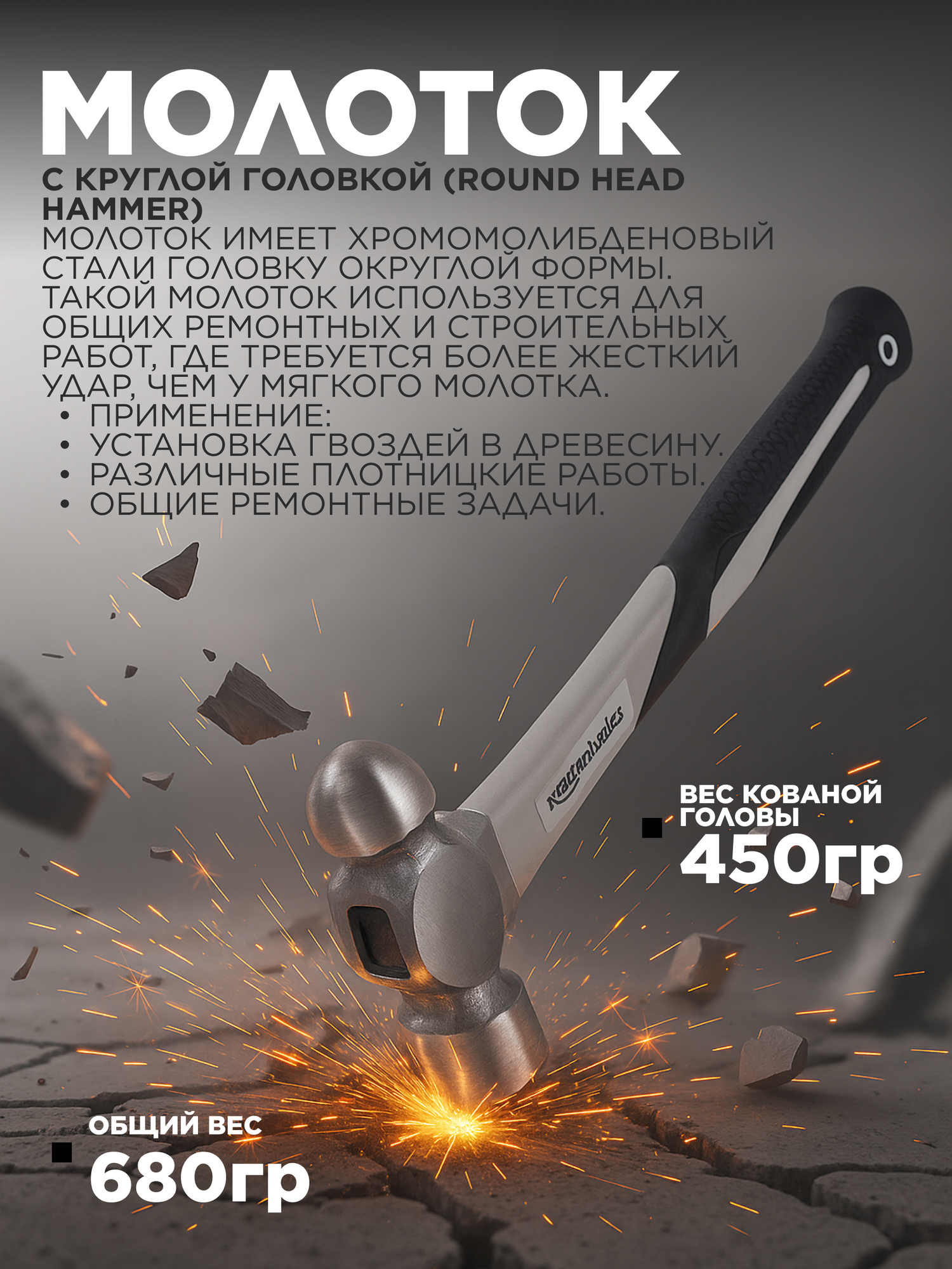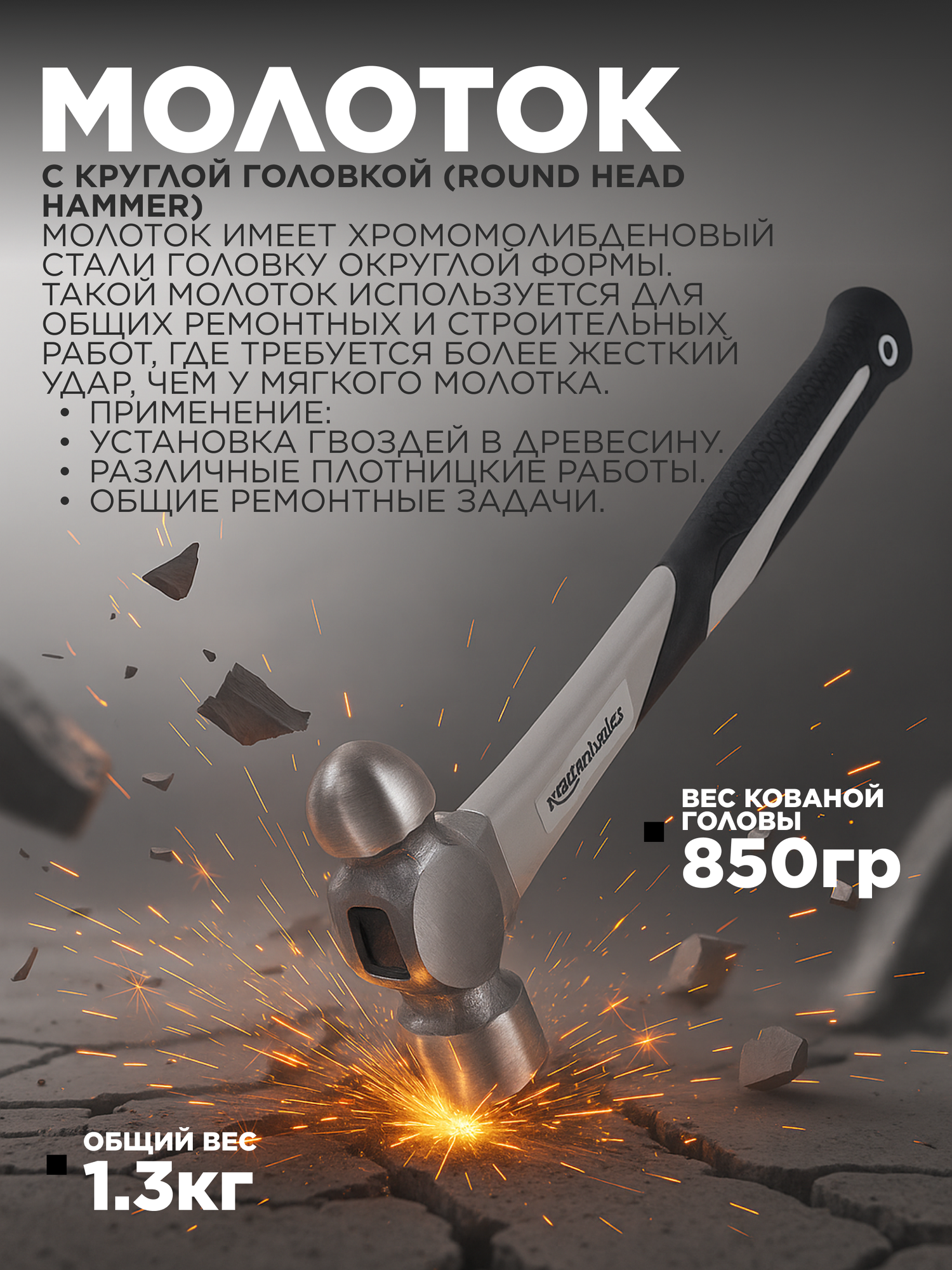 Прочность: Изготовлены из прочной стали, выдерживают интенсивную эксплуатацию Комплектация: Отбойный молоток 1 фунт (0,4 кг) Отбойный молоток 2 фунта (0,9 кг) Резиновый молоток 2 фунта Кувалда 3 фунта (1,3 кг) Три отбойных молотка по 3 фунта (1,3 кг)