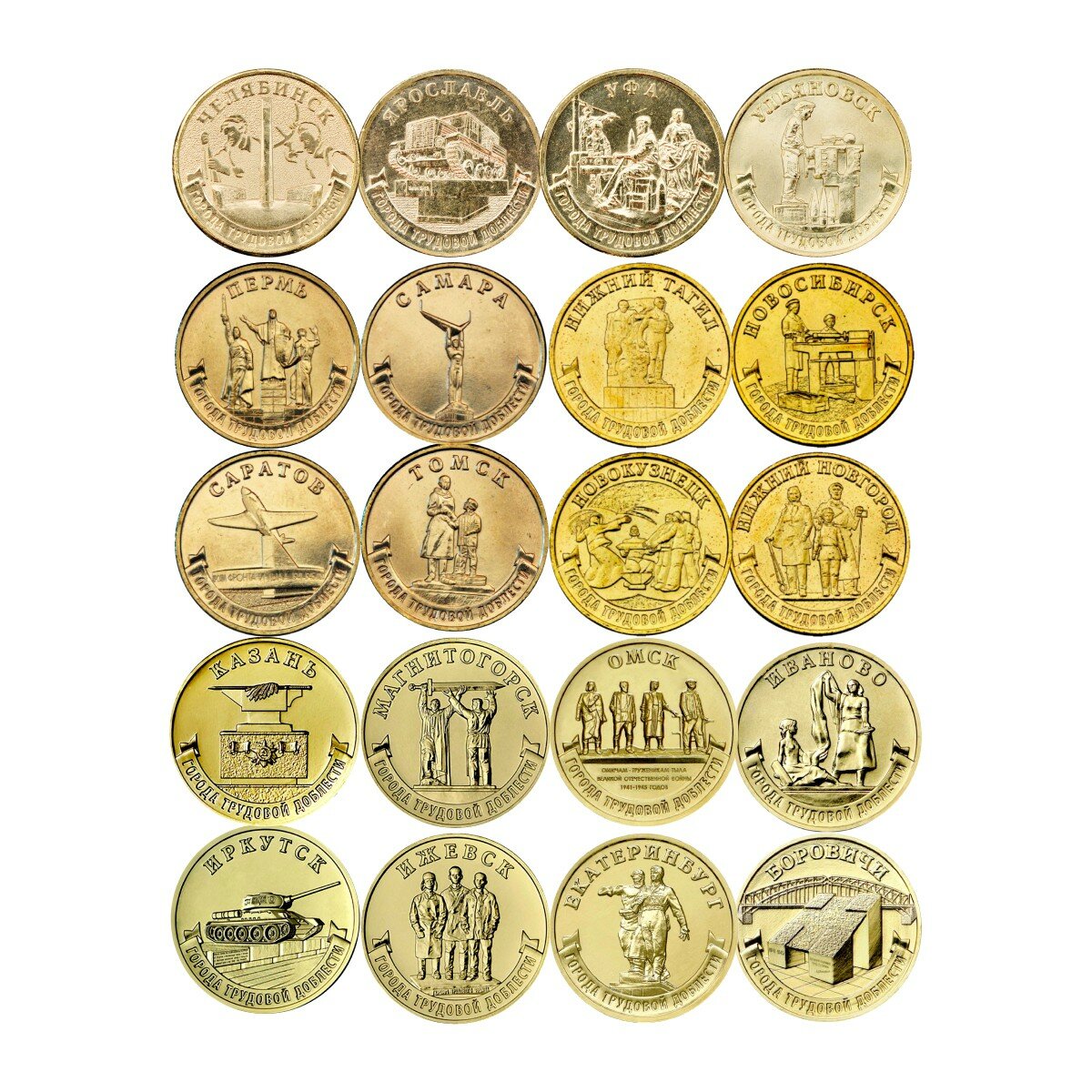 В состав набора входитят монеты номиналом 10 рублей серии Города Трудовой доблести выпуска 2021 Омск, Боровичи, Иваново, Екатеринбург 2022 Иркутск, Ижевск, Казань, Магнитогорск 2023 Нижний Новгород, Нижний Тагил, Новосибирск, Новокузнецк 2024 Пермь, Томск, Самара, Саратов 2025 Ульяновск, Челябинск, Уфа, Ярославль