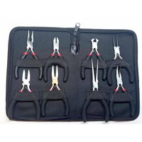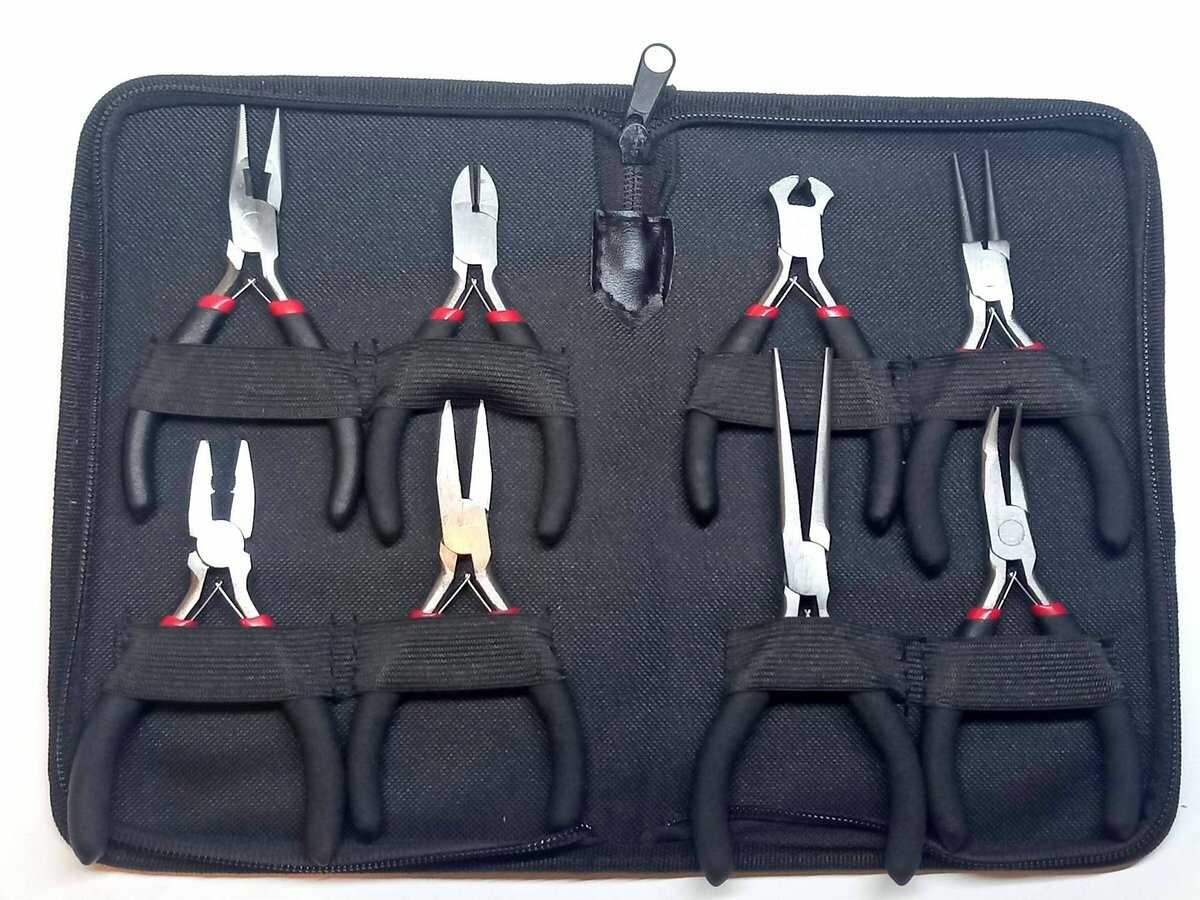 Набор миниатюрного инструмента для сборочных и монтажных работ с авторазжимом. Подходят для работ по сборке различных моделей, изготовлению изделий и дополнений из проволоки и тонкого листового металла, работ с пластиком. В набор входят: торцевые и боковые кусачки, прямые и изогнутые "утконосы", круглогубцы, мини-пассатижи, плоскогубцы с гладкими и рифлёными губками. Длина инструментов от 10 см (торцевые кусачки) до 15 см (прямые утконосы) Для удобной транспортировки и хранения инструменты размещены в аккуратном футляре на "молнии".