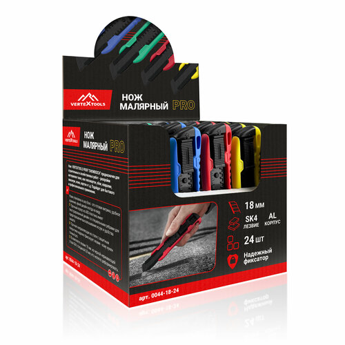 Нож VERTEXTOOLS PROFI "SHOWBOX24" предназначен для строительных и хозяйственных работ - раскройки материалов таких, как гипсокартон, обои, ковролин, линолеум, кожа, картон и т.д. Подойдет для бытового и профессионального применения.