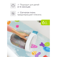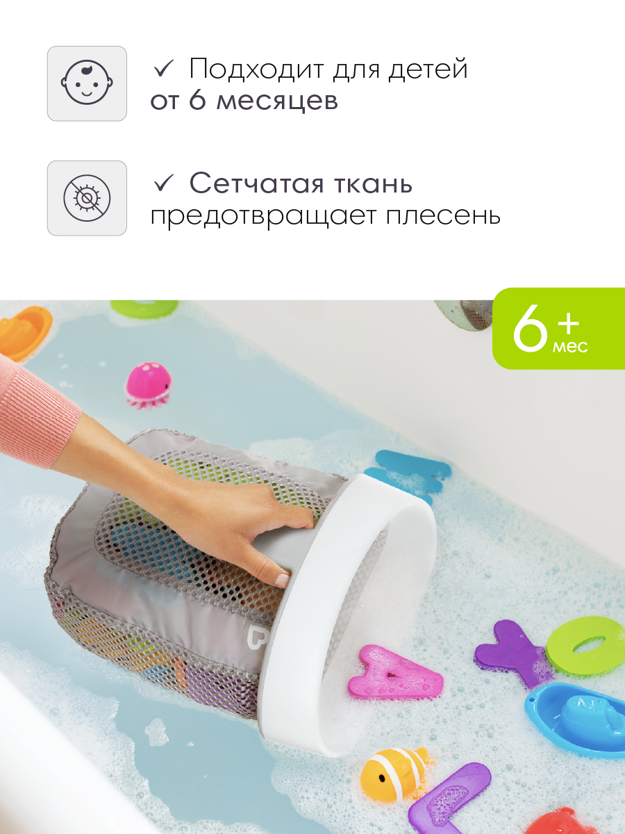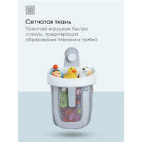 - органайзер для игрушек помогает содержать в порядке все принадлежности для купания - легко крепится к большинству поверхностей - сверхпрочная присоска - сетчатая ткань позволяет игрушкам высыхать быстрее, предотвращая появление плесени
