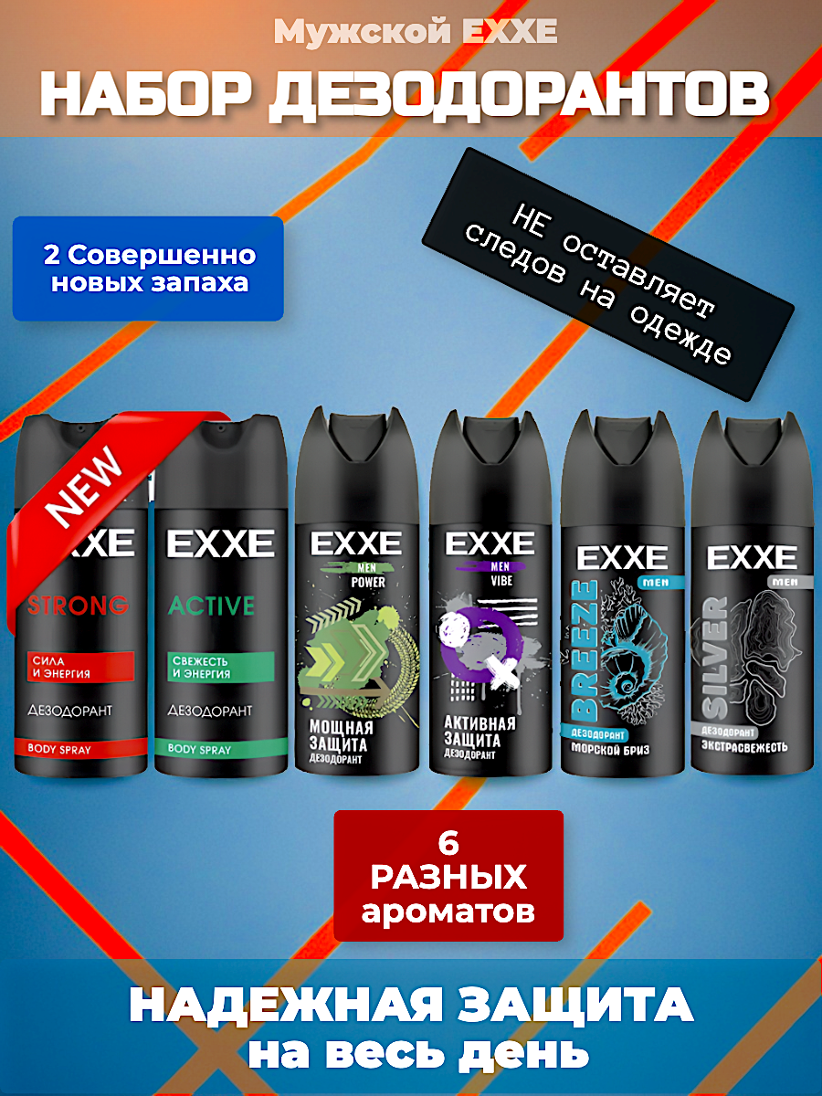 Купить Набор мужских дезодорантов EXXE Strong, Active, Vibe, Power, Silver, Breeze, 6 шт. с доставкой по всей России. Набор мужских дезодорантов EXXE Strong, Active, Vibe, Power, Silver, Breeze, 6 шт.: сравнение цен, характеристики, фото, актуальное наличие и цены.